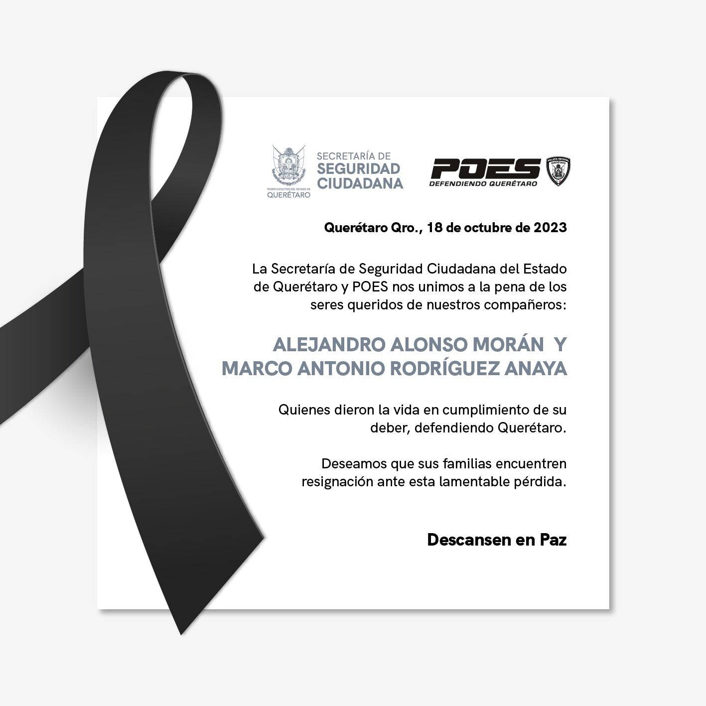 La Secretaría de seguridad ciudadana del estado de Querétaro lamentó la muerte de dos elementos de la Policía Estatal, quienes perecieron en un accidente en la carretera 57.