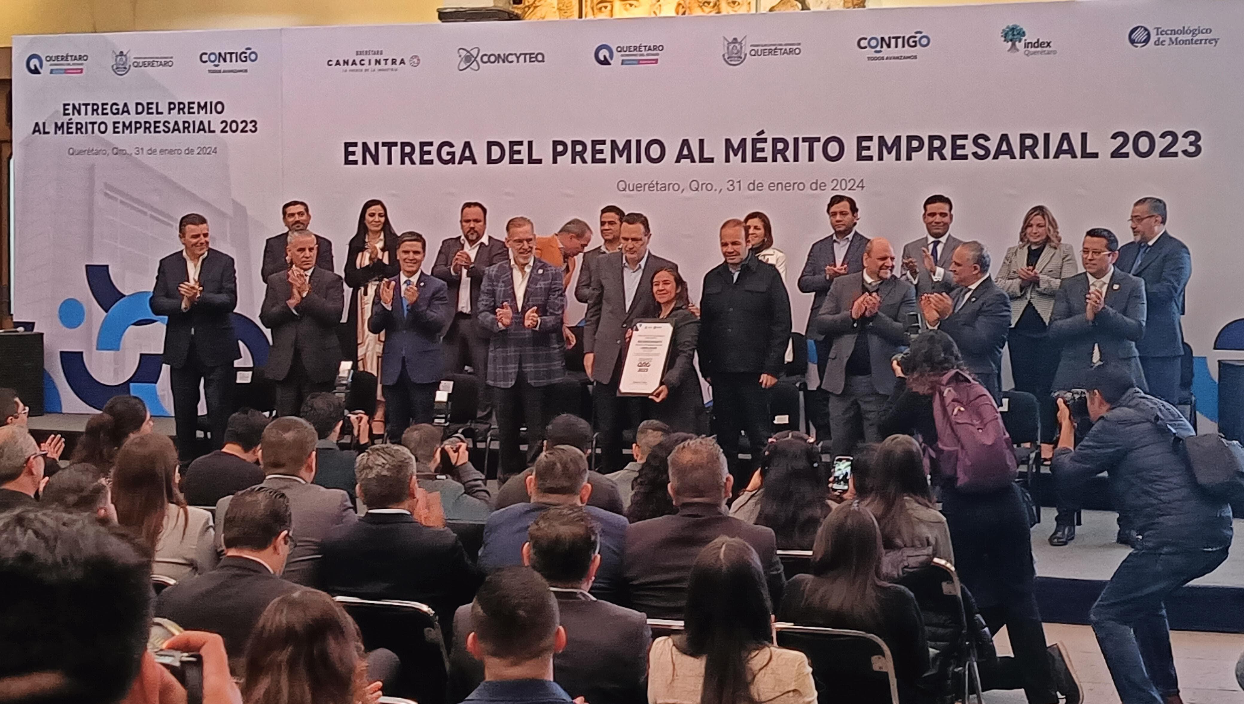 El gobierno de Querétaro realizó la entrega del Premio al Mérito Empresarial 2023, el cual reconoció a empresas, instituciones educativas y emprendedores por sus destacadas labores en exportación, implementación de procesos de calidad y mejora de la industria para la apertura de nuevos mercados.