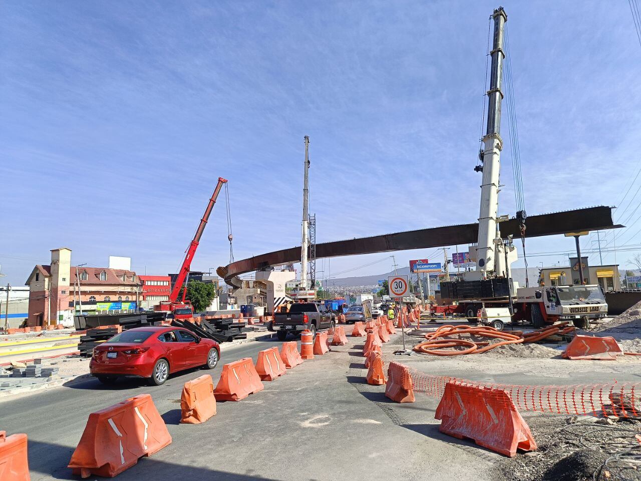 La parte de Tlacote es la que cuenta con más atrasos. En la zona se concentra la mayor cantidad de trabajadores y maquinaria, con al menos 6 grúas que trabajan en sus dos puentes elevados. De estos, el que va desde el sur de 5 de Febrero hacia la vialidad presenta un avance mayor a la mitad, con dos tercios de su estructura metálica colocada; sin embargo, el otro puente que va desde Tlacote hacia el norte de la ciudad todavía no cuenta con trabes metálicas.