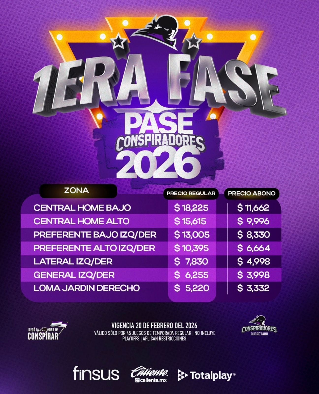 Los Conspiradores de Querétaro dieron a conocer los precios oficiales de su Pase Conspiradores 2026, que da acceso a los 45 juegos de temporada regular de la Liga Mexicana de Béisbol, con una primera fase de venta vigente hasta el 20 de febrero.
