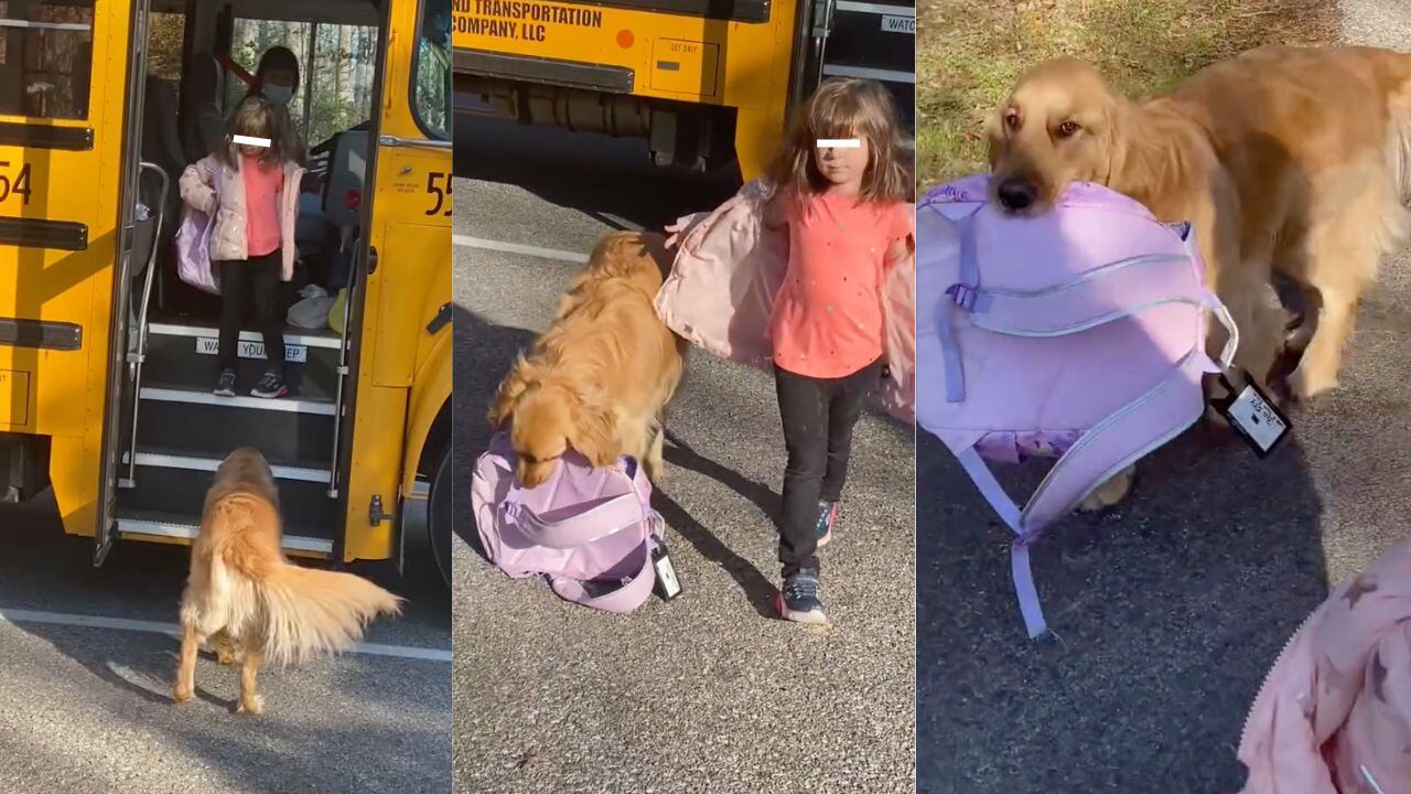 Sí, la mascota acude, todos los días, a la entrada de su casa para recibir a la pequeña del hogar. Al bajar del transporte, la menor es recibida por su amigo fiel, quien toma las pertenencias y facilita el trayecto, pero ¿solo lo hace con la infante? La respuesta es no, el golden retriever hace los mismo con todos los integrantes de la familia.