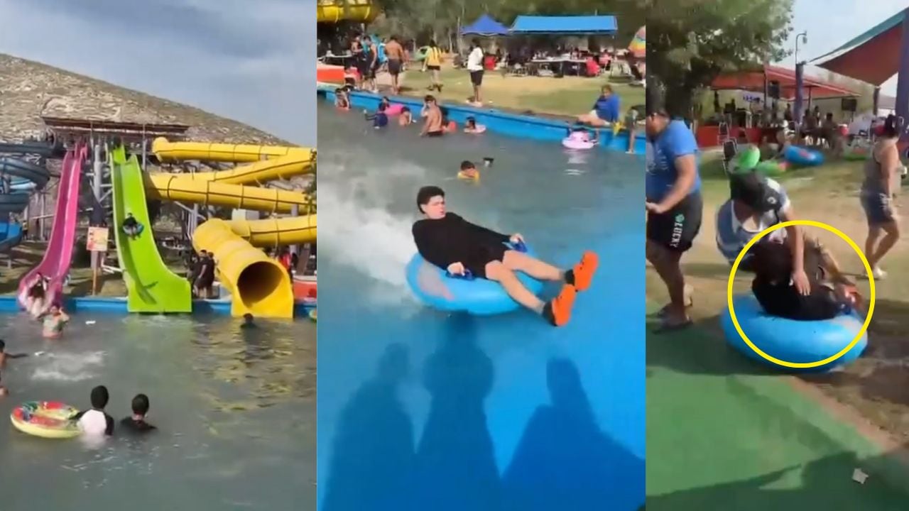 El tobogán le brindó bastante impulso para caer, sin embargo el adolescente siguió hasta más allá del agua. En vez de soltarse, el joven optó por aferrarse al inflable y seguir hasta impactarse con otro hombre que no logró esquivar la “bola humana”.