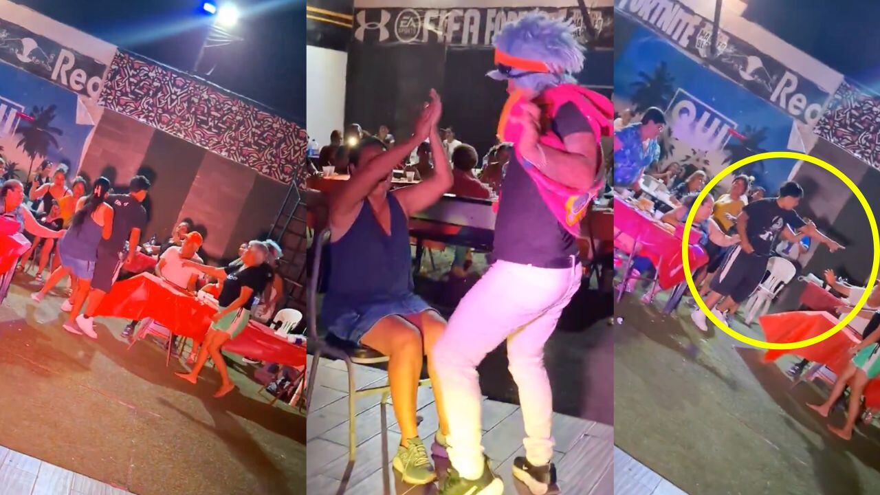 La mujer que estaba sentada en la silla tomó al inconforme y junto con otras presentes sacaron al hombre del que hasta el momentos se desconoce su identidad o qué relación tenía con la señora a la que el payaso le bailó.